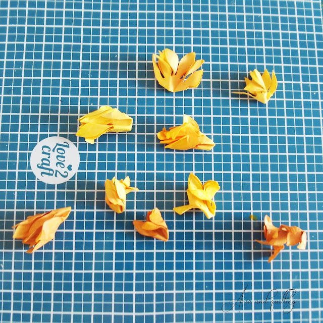Płatki spryskuję delikatnie wodą, by tusz się rozpuścił i zgniatam/zwijam w palcach,